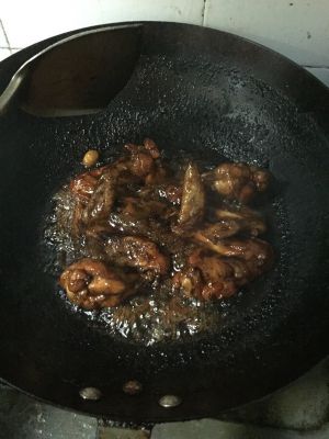 3、适当的油放入炒锅中,微热后先放八角翻炒出香味,放入葱姜蒜翻炒。再放入翅中煎,煎到翅中两面金黄(经常翻动,多煎一会)在煎的过程中可把变色的葱姜蒜和八角挑出,不挑也可。翅中变金黄后放入适量的料酒和生抽,翻炒几下后,倒入可乐,可乐和翅中平就可以,也就是可乐刚刚没过翅中就可以,如果喜欢甜一点就多放一点可乐也可以,或者少放点生抽。放入可乐后盖上锅盖大火5分钟,改小活顿一会。没看时间,大概几分钟就好,(这就要看之前水煮的时间了)。汤没关火装盘!