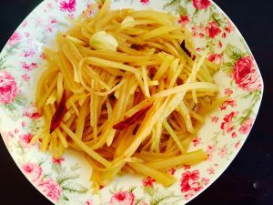 锅里放入土豆丝,大火爆炒,放入适量水转小火,焖一小会,放入醋,少量白糖,中火再炒,出锅前放盐,也可再倒入少量味极鲜。