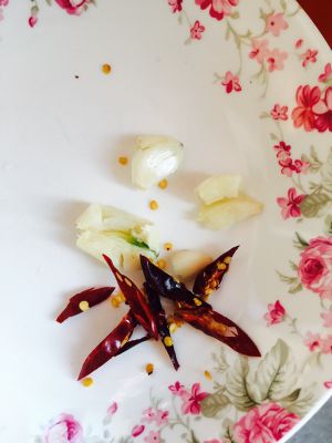 蒜头用刀拍碎,辣椒剪成细丝,因为小乖要把辣椒挑出来扔掉,所以我剪的稍微大一点