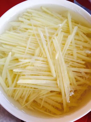 土豆洗净去皮切丝泡水备用,个人觉得刨子弄的土豆丝口感太差,喜欢用切的