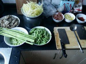 准备好原料,洗好的四季豆,肉,郫县豆瓣,碗里(朝天椒,麻椒,白糖,葱花,蒜末,郫县豆瓣适量)