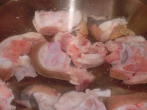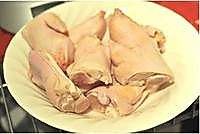 猪脚剁成小块洗净,在沸水里稍煮一下,去除浮沫。(选用猪前脚)