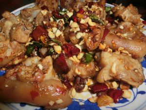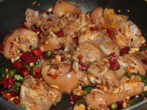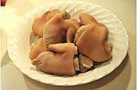 捞出猪蹄放入凉水,冷却后将其捞出切小。骨头宰不动可以将肉剔下来