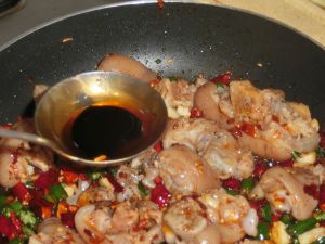 放入猪蹄翻炒数下后,加入生抽、料酒、冰糖