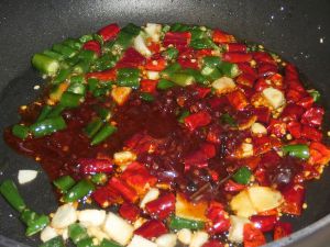 锅适量油烧热放入剪好的辣椒段,小火炒香