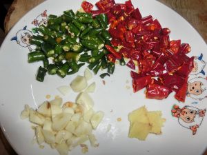 干辣椒,青辣椒剪成段,蒜切成粒,姜切成小片