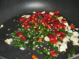 热油,把蒜、干辣椒、青辣椒放入锅中炒香