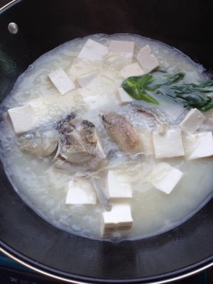 豆腐用开水焯一下 倒入锅中 小火与鲫鱼一起炖10分钟
