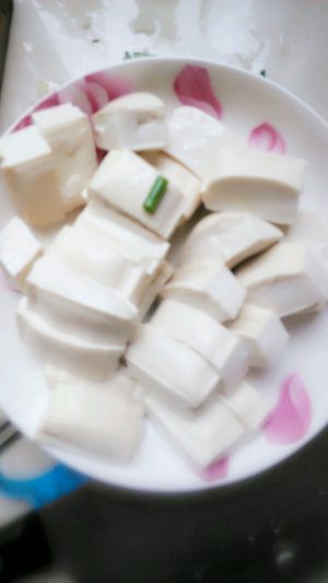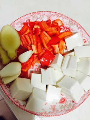 豆腐切小块,红椒切块,另切三片生姜,三瓣蒜头