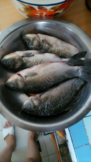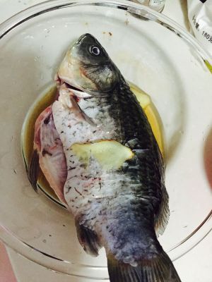 鲫鱼清洗干净,用盐涂抹全身,淋上料酒,鱼肚里放上两片姜,腌制15分钟