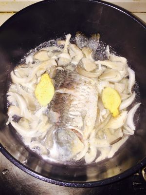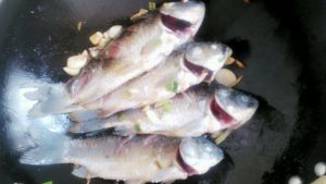 倒入鲫鱼 炸一下 至鱼眼鼓出来 倒入清水烧开