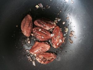 油热后放入葱姜鸡翅进行煸炒,炒的久一点,不要焦了。