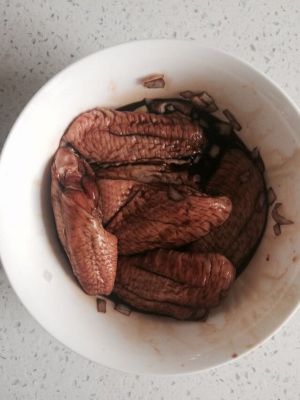鸡翅洗净后,在每面用刀划两刀,然后加入适量料酒、生抽、老抽、醋和葱姜腌制15分钟,用手抓一抓。