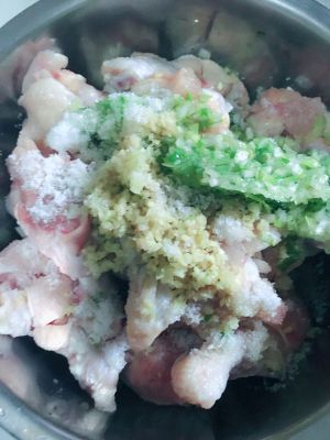 葱切葱末,姜切姜末(葱我用了一根,姜看着量差不多就行),盐2勺,大概20g左右,料酒50g左右,抓匀放进冷藏室腌制一个晚上
