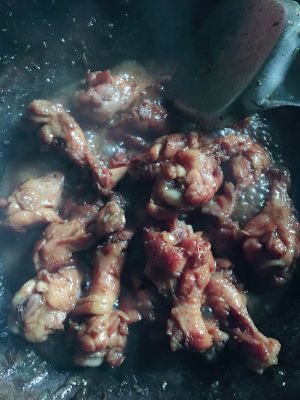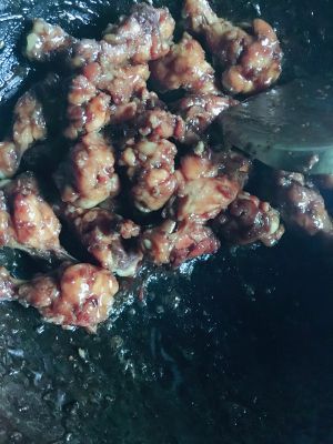 可乐大概下去一半了就可以开始翻炒了,一直翻炒,避免粘锅