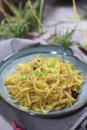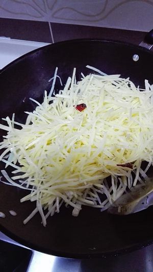 热锅凉油,放辣椒段,葱花,蒜片煸香,放焯水的土豆丝,翻炒几下炒匀。加味:上面的列出的调料的量适合大众口味,加醋的时候最好把醋撒在锅最热的地方,把醋的香味可以更好的挥发出来