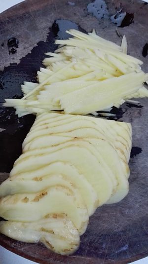1:把土豆切成细细的丝,越细越好。过两遍冷水备用。