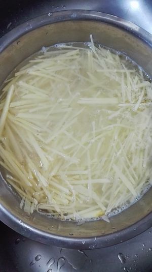 土豆切片切丝,把切好的土豆丝泡入冷水中,去除部分淀粉
