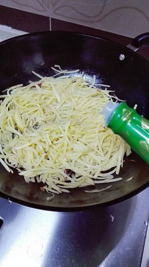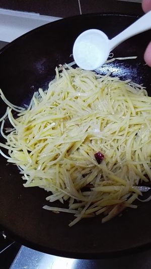 然后下入土豆丝,翻炒均匀加入白醋,再加入盐,鸡精,白糖