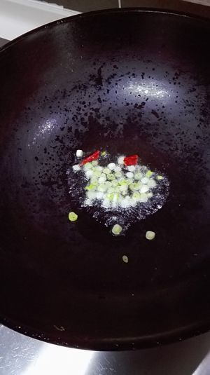 炒锅放适量的油,放入少许的干红椒、香葱末炸出香味