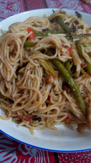 接下来就是炒的过程,放油,然后是菜,肉,本人比较喜欢吃青菜肉丝,加老干妈,青菜,肉丝,炒熟,然后下面条,海鲜酱油,适量的胡椒粉,炒一下,然后就可以装盘食用了,喜欢吃鸡蛋的,可以提前炒个鸡蛋,加进去也是一样的。