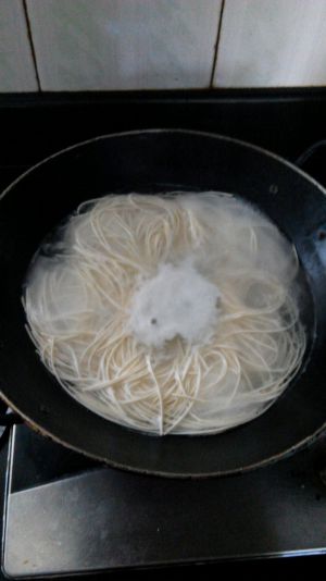 面条放开水中煮开,捞出拌油待用