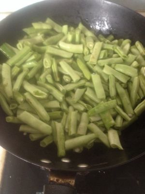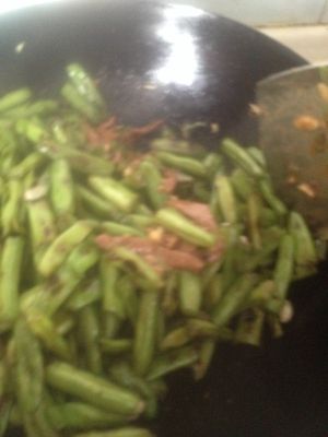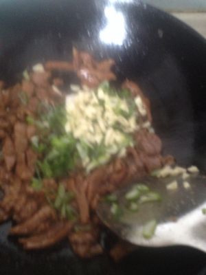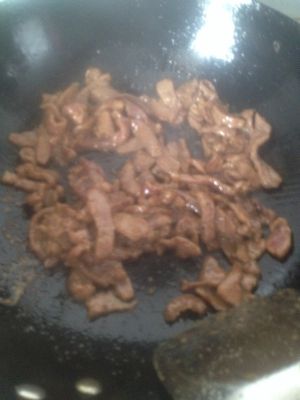 肉变黄后开始放入其他食材,蚝油、鸡精等调味料