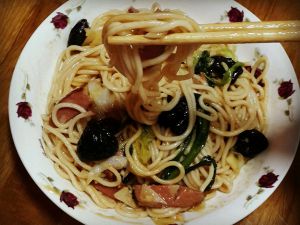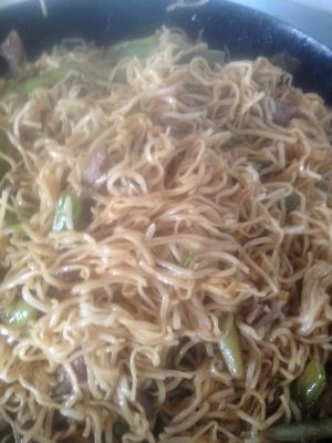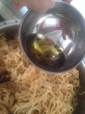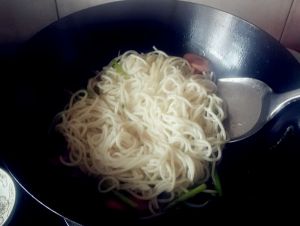 面条放锅里,翻炒几下,加点海鲜酱油,炒匀,放些蒜末即可,不要炒时间太长,面条就不劲道了