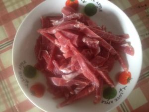 猪肉切丝不要太细用酱油,料酒,姜汁、蚝油,拌匀,加淀粉拌匀腌制
