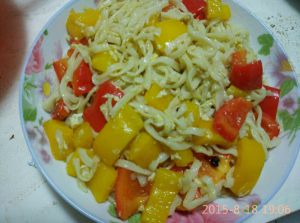 做起来非常简单,煮好面备用,炒青椒(炒菜一样的步骤),熟的差不多了,变软了吧,我爱吃熟透一点的,加面,简单搅拌,使之入味即可出锅。