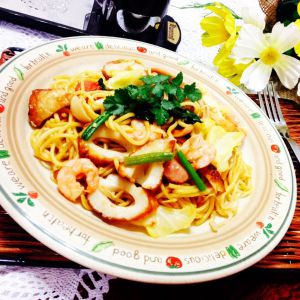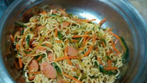 锅不用洗,继续倒油,烧热,倒入洋葱和胡萝卜片翻炒2mins,加入沥水的乌冬面翻炒,加入意大利面酱(番茄罗勒风味),翻炒2mins出锅。