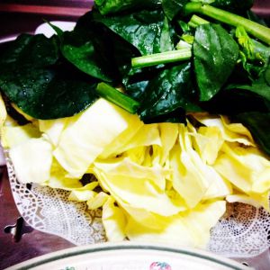 接着放入泡好的面翻炒几下,然后放入盐,味精,豆瓣酱继续翻炒至菜和面混合均匀