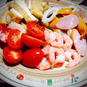 小西红柿和虾仁、豆腐,香肠、葱都切好