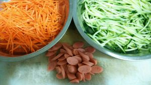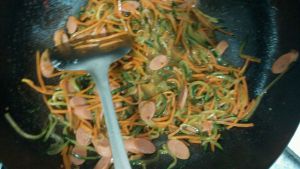 锅里放油烧热,依次放入香肠,胡萝卜丝,黄瓜丝炒至八分熟