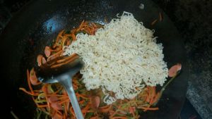 然后放入煮好的面条一起翻炒(此步骤筷子比锅铲好用),翻炒均匀之后盛出