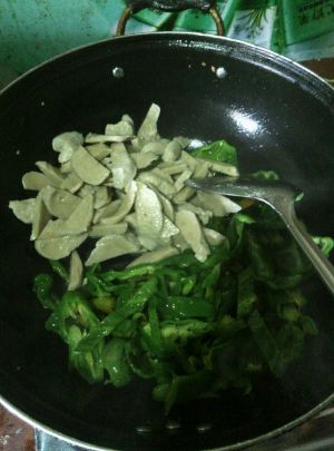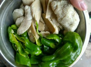 先把青椒炒软在下面筋炒~对了要比平时多点点油