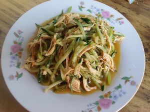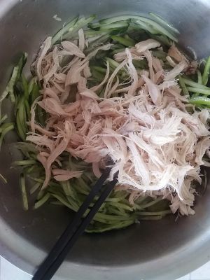鸡胸肉,煮好后,可以过凉水,也可以不过,看个人,撕成小条,放入黄瓜中,放入,生抽,油泼辣子,一点点醋,蒜末,拌匀就好了。