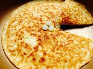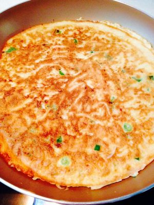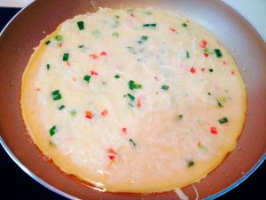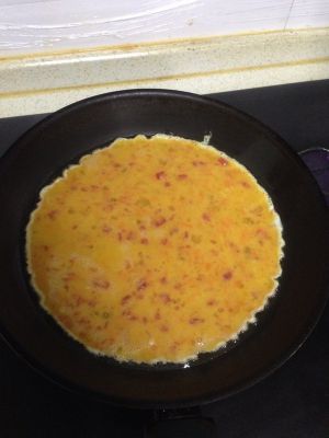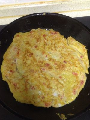 平底锅放少量油,大火烧旺后转小火把鸡蛋液倒进锅里,小火煎摊(小心焦掉),底层凝结后翻面