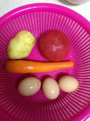 原谅我的拍照渣水平… 土豆丝、胡萝卜丝、番茄切细