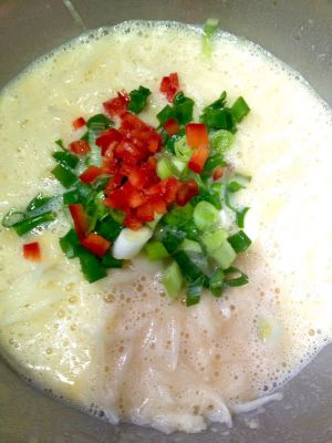 静止五分钟,萝卜丝析出水分!煎之前、加入葱、青椒拌匀。