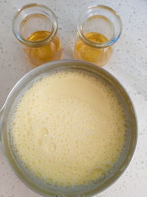 先将焦糖倒入布丁瓶再慢慢加入牛奶液,要轻轻防止起泡沫。