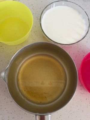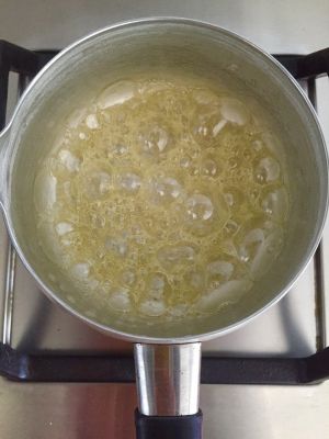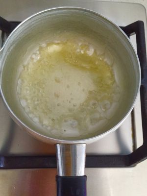 找一个小奶锅,放入60g白砂糖和70g凉水,我看到有人说用热水煮焦糖,我都试过,感觉没什么区别,就是热水用的时间稍微短些,千万不要用勺子搅拌,等到锅里冒泡泡,上焦糖色时,左右晃动奶锅,上色均匀