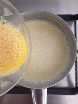 把牛奶放入奶锅煮,温热关火,加入打散的鸡蛋液,轻轻搅拌