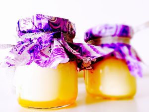 把牛奶蛋黄混合液倒在焦糖上面,一定要慢,尽量不要把焦糖冲散,大概八分满就行了。现在把瓶子或碗的盖上,隔水蒸大约四十分钟。