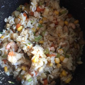 做好的米饭和什锦蔬菜翻拌均匀,盖上锅盖继续闷饭,再做一个煮饭程序就OK了。