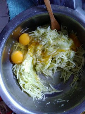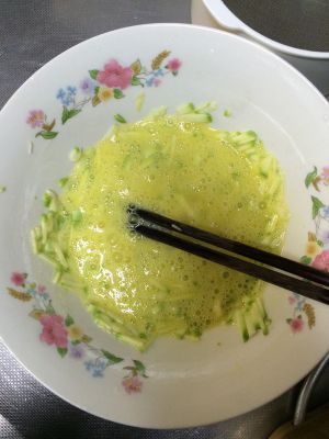 鸡蛋放入擦好丝的西葫芦内 拌匀