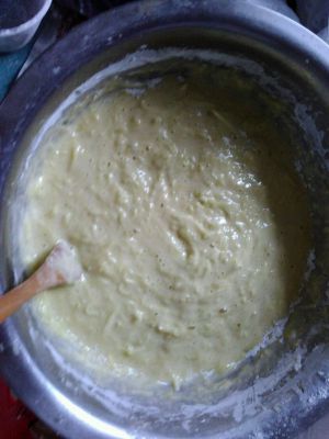 加两个鸡蛋拌匀,然后加入适量面粉,调成糊状