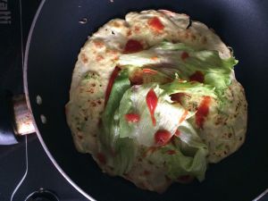 两面金黄,放些孩子爱吃的番茄酱和生菜。这里可以根据家人口味,放花生酱什么的都行。但说实话这样的糊塌子就不正宗了,但好处是孩子爱吃。