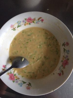 鸡蛋面粉和水搅成稀面糊,把西葫芦葱花玉米粒放进去,搅匀