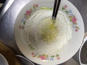 放入盐 放入面粉和水 搅拌成糊状 (有的人放的盐多 可能还会出水 所以水放的要适量!!!)
